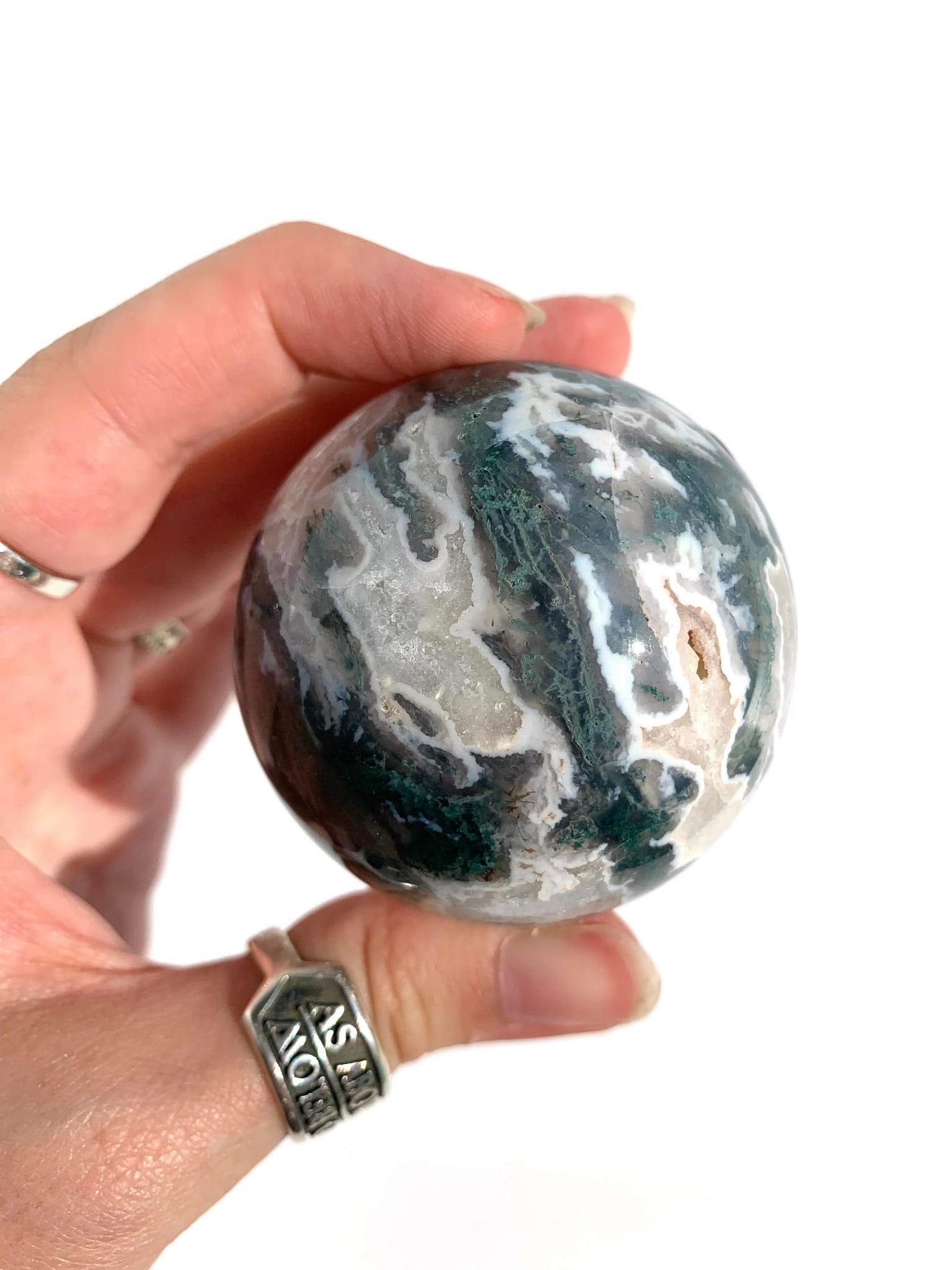 Agat mszysty to odmiana agatu i chalcedonu. Piękny zielony kolor oraz magicznie zaklęte w nim fragmenty mchu to tak naprawdę wtrącenia zielonej hornblendy lub chlorytu. Pod względem właściwości działa jak nieśpieszny spacer po lesie – wyciszy nas, uspokoi oraz pomoże głębiej zrozumieć nasze emocje oraz poukładać myśli.
